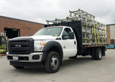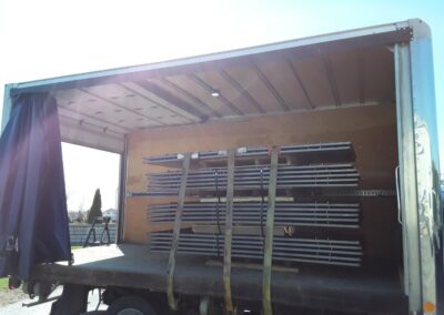 Flatbed truck delivery of masts sections to be used at a construction site.