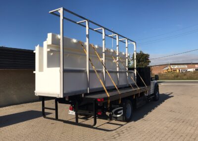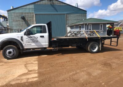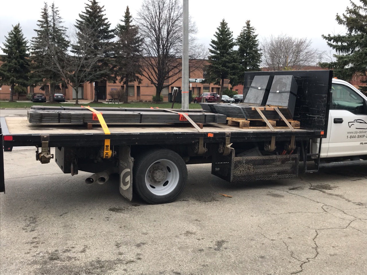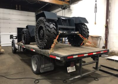 Flatbed truck delivery of a chassis using chain tie-downs.